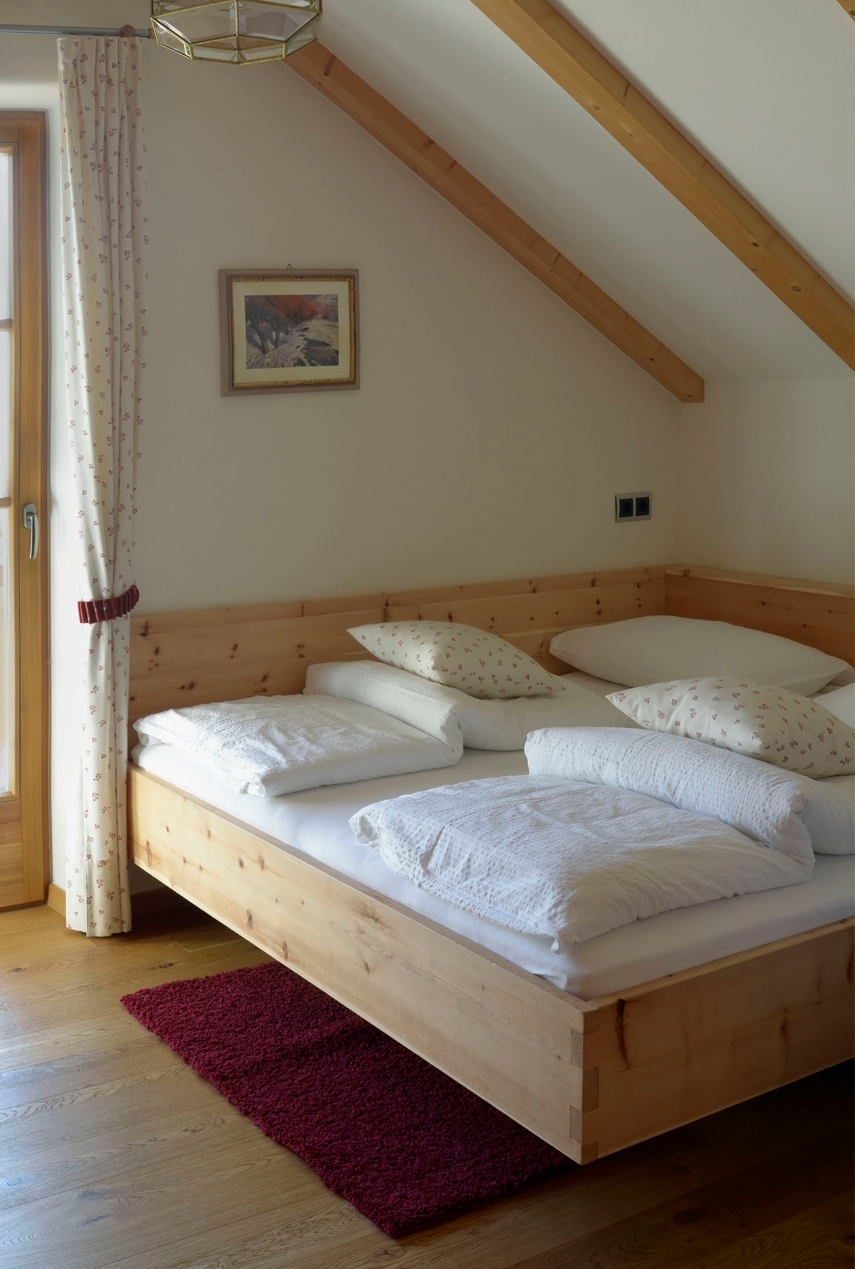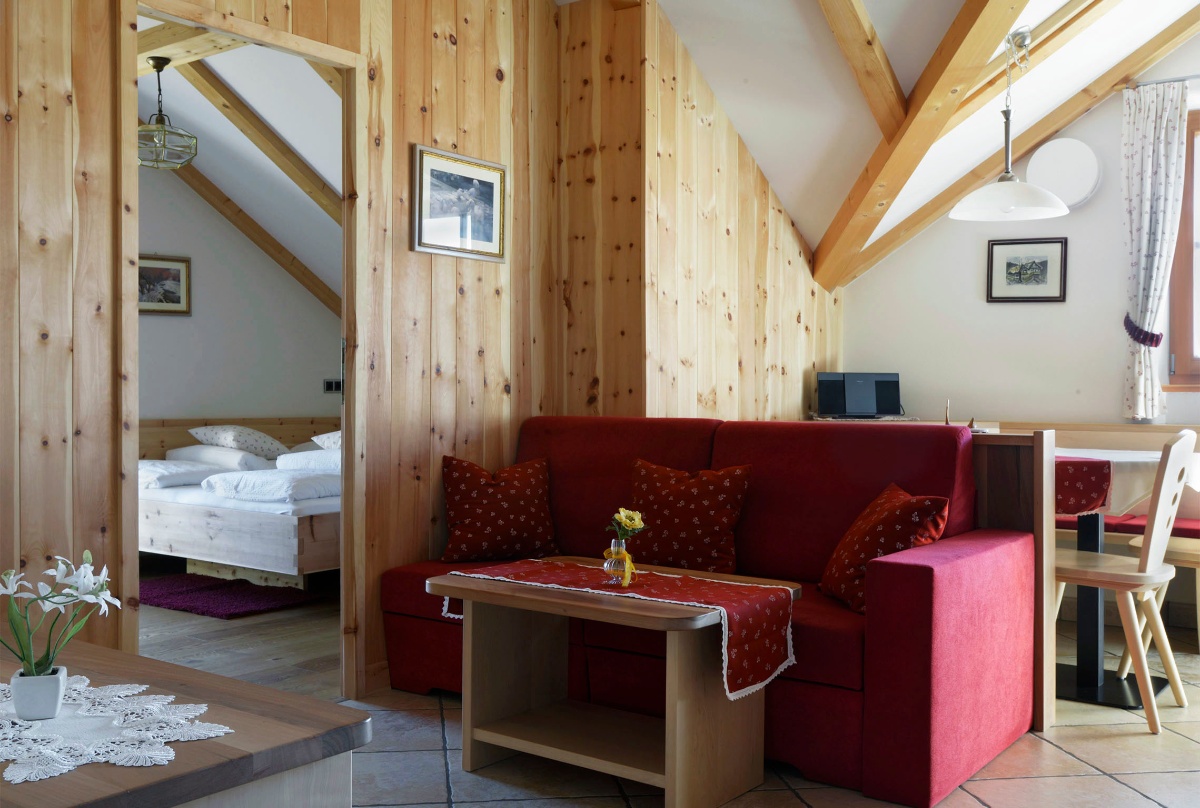 Die 60m² große Wohnung im Obergeschoss ist ebenfalls mit allem erdenklichen Komfort ausgestattet. Küche, Bad, TV, Safe und Garderobe gehören zur Grundausstattung. Die Wohnung besitzt zwei getrennte Schlafzimmer; in einem befindet sich ein Doppelbett und ein Schrankbett, im anderen ein Doppelbett mit einem Stockbett. Gleich zwei Balkone lassen das Sonnenanbeterherz höher schlagen. Außerdem ist diese Wohnung die einzige, bei der man mit freiem Auge das berühmte Schloss Stein in einer bewegenden Kulisse bestaunen kann.